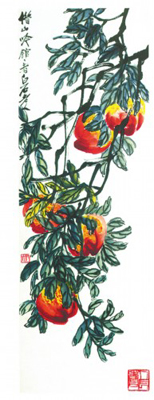 齐白石的《寿桃》,桃的画法变化吴昌硕的“点法”为“写法”,上部用较为浓重的胭脂一笔笔写出,且分出浓淡,下部着以藤黄而成,叶子墨中略加花青和藤黄,仍给人“墨”的感觉,产生“红花墨叶”的视觉效果。全图桃的用色浓艳泼辣夸张,与简疏的叶枝对比强烈,使整幅作品看上去显得丰富又天真。