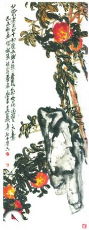 吴昌硕的《桃石图》,创作于1919年,是年吴昌硕76岁。画面右侧一粗干自下向上,两簇茂密的枝叶中,斗大的桃实或隐或现,上下呼应,用鲜艳的西洋红和藤黄结合点出,处处能见用笔的轨迹,整件作品风格热烈昂扬,笔墨纵横,充分体现出吴昌硕深厚的篆籀书法功底。