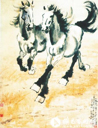 据介绍,与其它奔马作品不同,此幅双马在奔腾中似有交流,喻示了一种战争中的友情。此外,右侧马伸出的前蹄被适当拉长了,这种比例略微失调带来的错觉,实是画家运用了透视学原理,以使该马显得更加神速,两条前腿几乎要腾空而起,为徐悲鸿晚年的画马佳作。