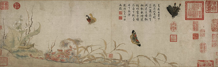 图绘群蝶恋花的田园小景。轻灵振翅的蛱蝶起舞于画幅的上半部;秋花枯芦摇曳于画卷的底边。在物象表现上,作者用双勾填色法画土坡、草丛、蛱蝶。其勾线富于顿挫和粗细变化,墨色亦有浓淡轻重之分,敷色积染多层,特别是蛱蝶的翅翼更因积染而色彩浓艳厚重,从而与主要以植物色染就的草叶形成“轻”与“重”的对比。图中蛱蝶的形象最为传神,作者逼真地刻画了蛱蝶之翼薄如绢纱的质感、绚丽斑斓的花纹和蛱蝶细如发丝的根根须脚。传神的笔墨展示了作者深厚的写生功底,使本图成为研究古代蝶种的形象资料。作者不愧有“写生赵昌”的美誉。著录于清内府《石渠宝笈》。