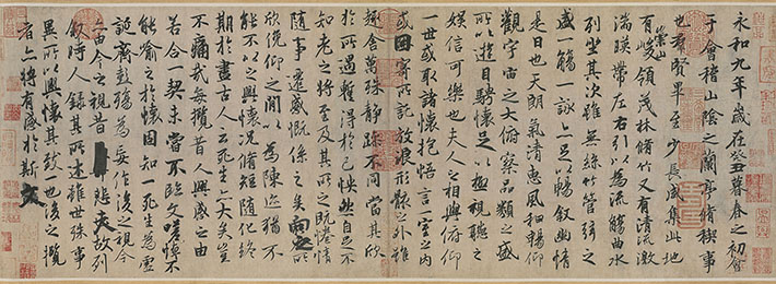 此卷前纸13行,行距较松,后纸15行,行距趋紧,然前后左右映带,攲斜疏密,错落有致,通篇打成一片,优于其它摹本。用笔俯仰反复,笔锋尖端锐利,时出贼毫、叉笔,既保留了照原迹勾摹的痕迹,又显露出自由临写的特点,摹临结合,显得自然生动,并具一定的“存真”的优点,在传世摹本中最称精美,体现了王羲之书法遒媚多姿、神情骨秀的艺术神韵,为最接近原迹的唐摹本。